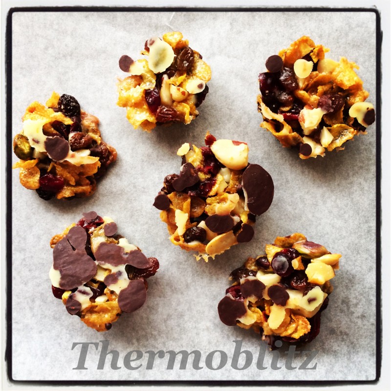 Add in the fruit cornflakes and nuts and mix through speed 1 for a few seconds until mixed through