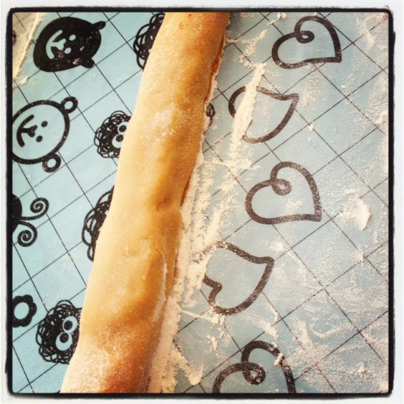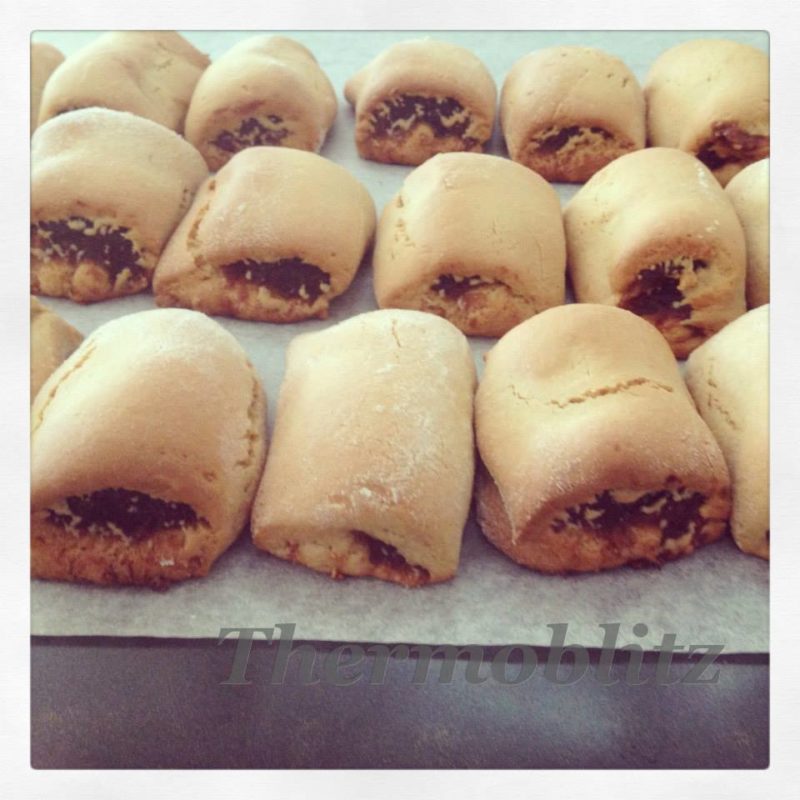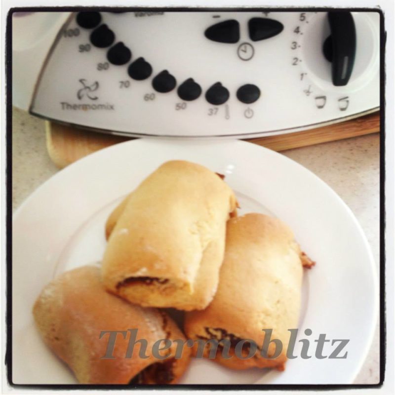 After 2 hours pull out dough and roll out to a larger rectangle on a very well floured surface Divide into 3 long strips lengthways and spoon the filling along the middle about an inch wide .Wet one edge lengthways all the way along and roll the dough over to form logs Then slice into biscuit size pieces and place on to a baking tray lined with baking paper
