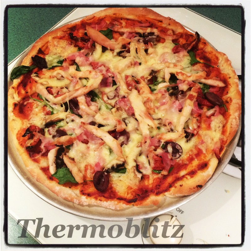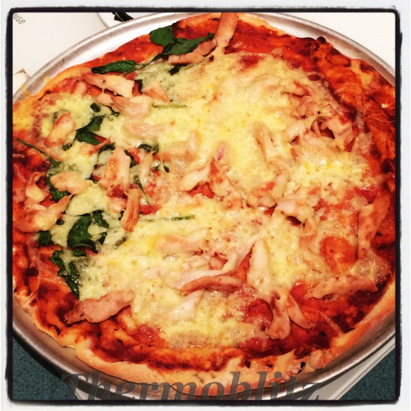 Spread with Tomato Pizza Sauce lightly and put in the oven for around 6-7 minutes then add on your toppings.. With one there was just chicken and cheese on one half and Baby spinach . With the other there was the lot ! Baby Spinach, Chicken, Ham, Olives, Sundried Tomato’s, Mushrooms and of course Cheeses! You can put anything you like !
