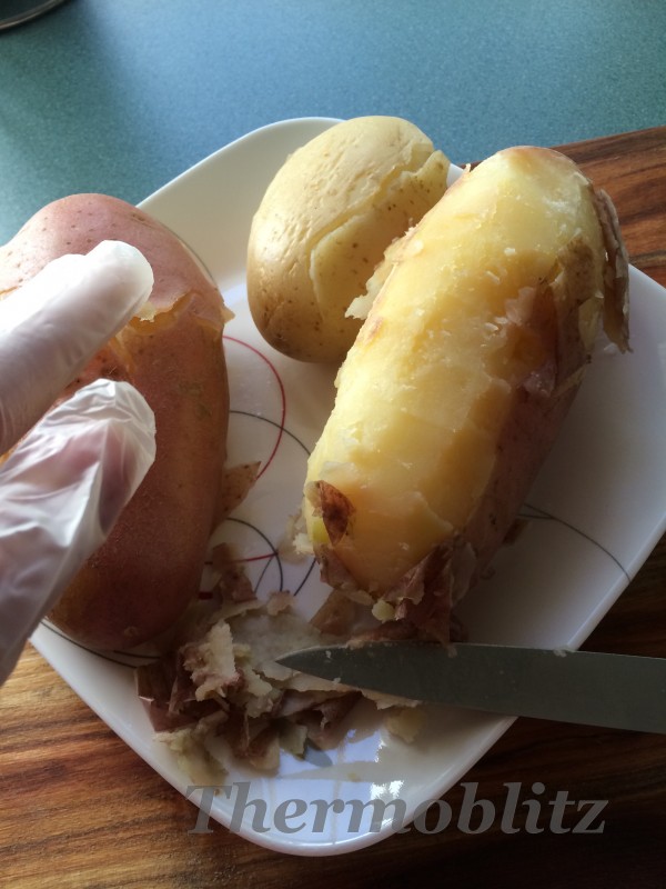 You will need around 850 g of Potatoes, I had 2 very large red skinned ones and one smaller potato.