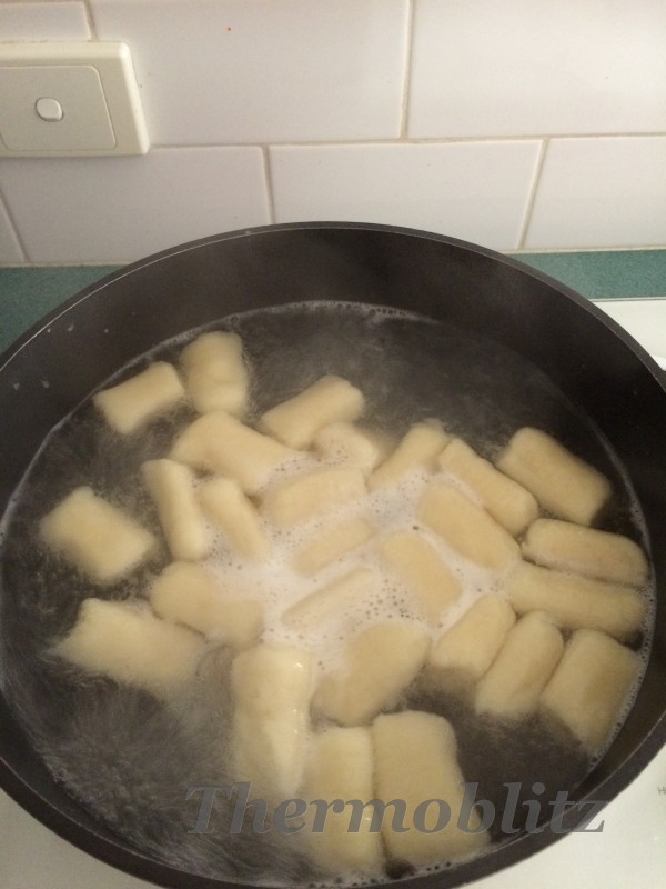 Bring a Pot of salted water to the boil and put Gnocchi in batches (so as not to overcrowd them) until they float to the surface (meaning they are cooked)
