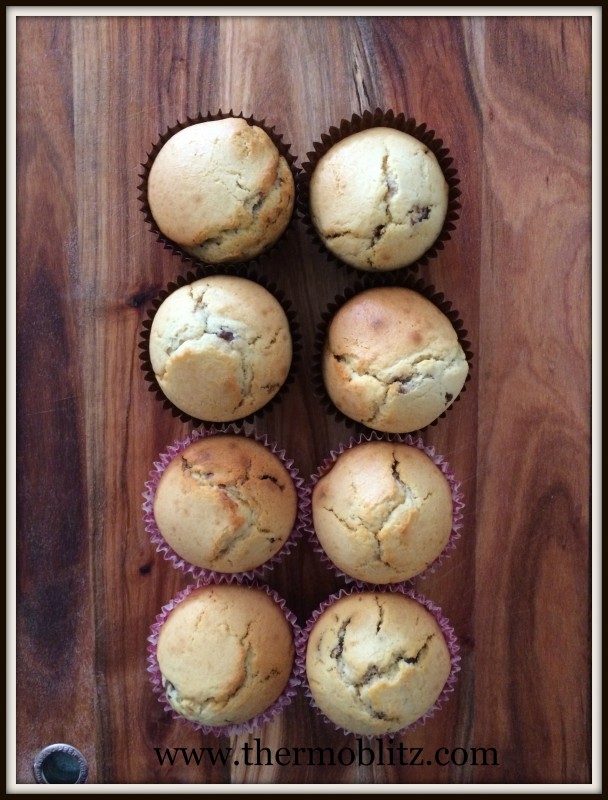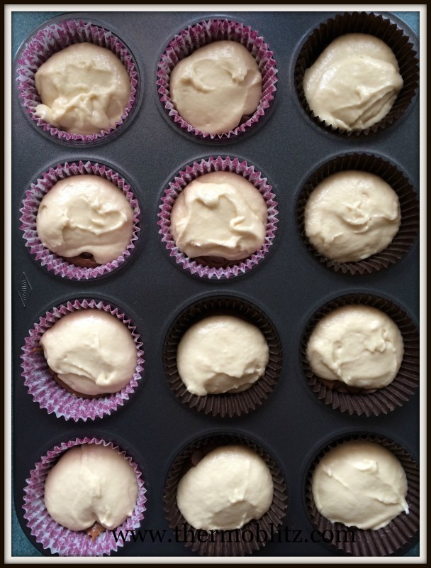 When whipping up a batch of my Spreadable Butter ( recipe HERE ) I had my left over buttermilk and decided to whip up a batch of Cupcakes today rather than freezing it. I was going to whip up a batch of half and half Chocolate and Vanilla and then put some choc chips through the chocolate and some Blueberries through the Vanilla…Next thing I was making Chocolate on the bottom and Vanilla on the top with a layer of Choc Chips in between ! I love it when you have an “accidental” creative idea
