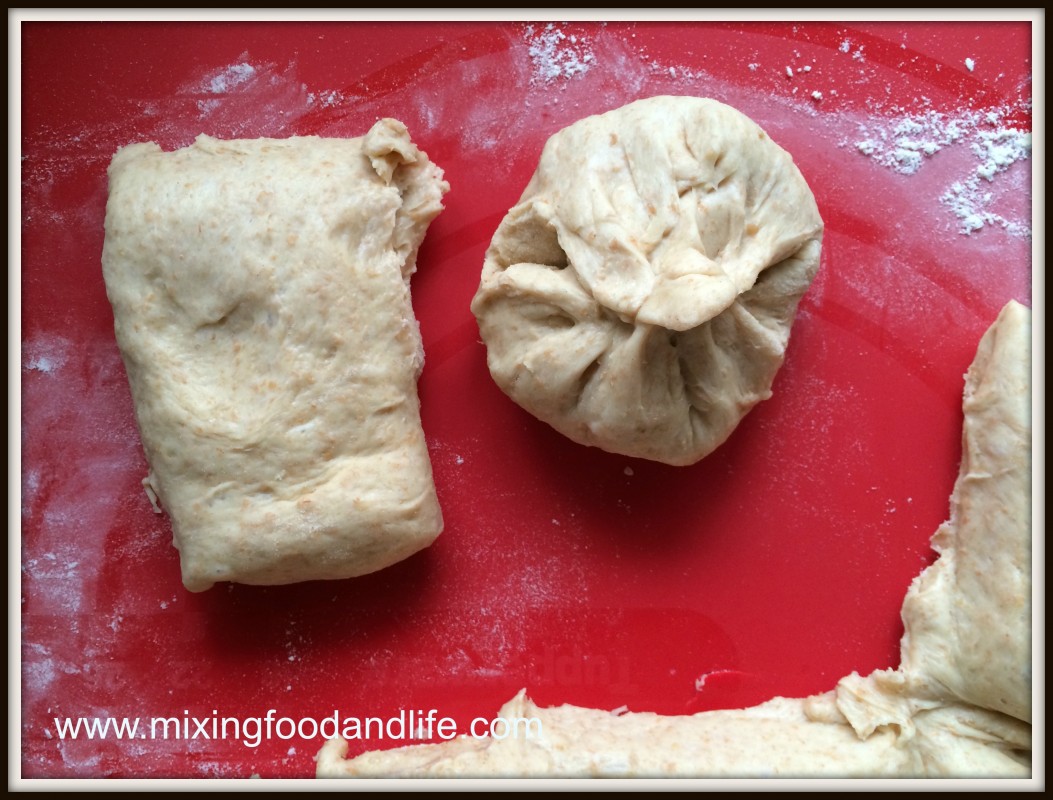 Then turn over a square of dough and pinch corners into the middle of the back of the underneath of the rolls Shape into roll
