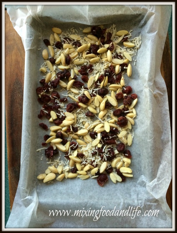 Whilst all that is happening sprinkle almonds , shredded coconut and craisins into a lined tray.