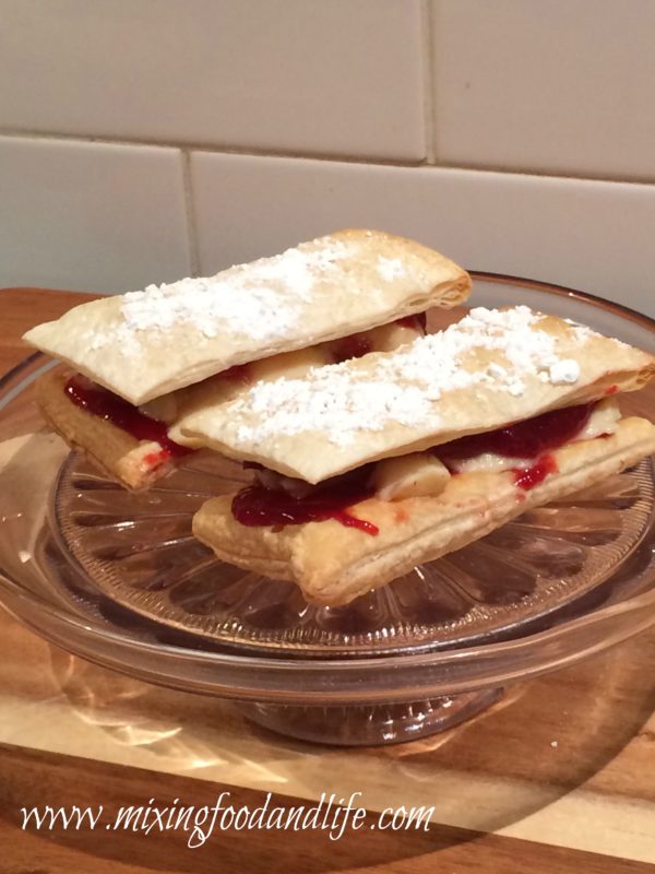 Allow to cool and spread two of the puff pastry “matchsticks” with jam and custard .